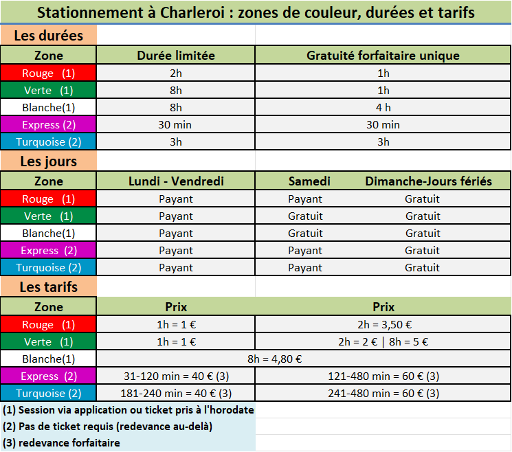 Charleroi est divisée en plusieurs zones, chacune ayant des règles spécifiques :